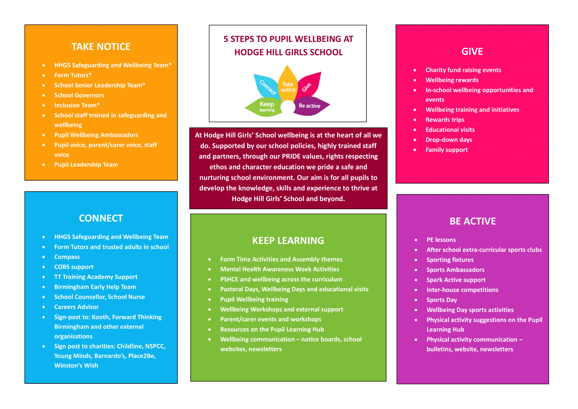 Here at Hodge Hill Girls' School, we have a strong initiative in place for the safeguarding and well-being of staff, students, parents, and the wider community around us.