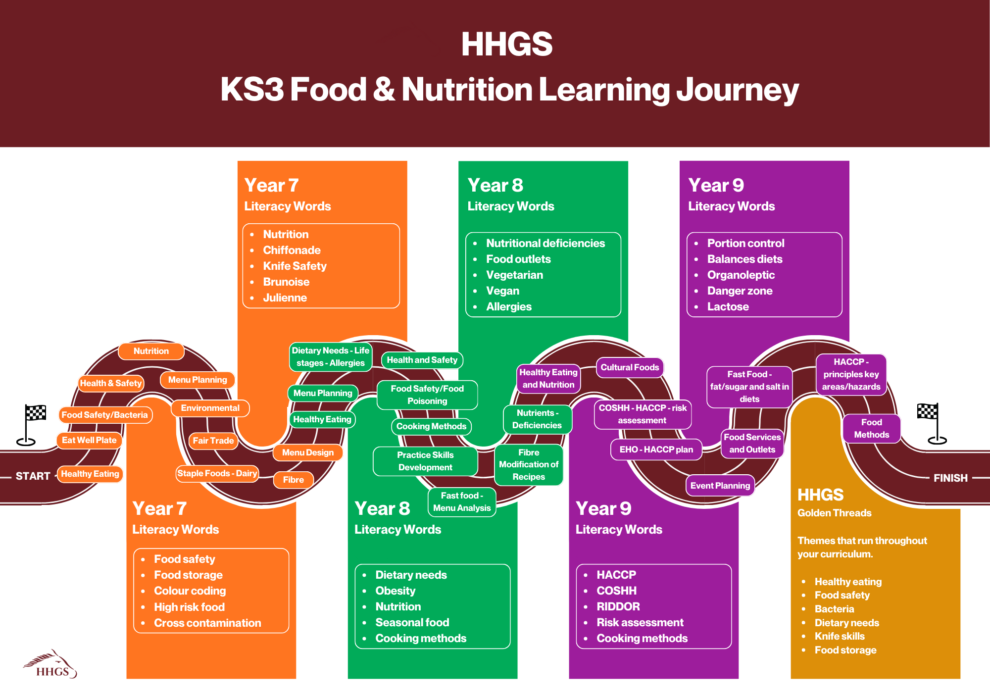The main aim of teaching food starting at KS3 and moving onwards to KS4 is to develop students’ culinary skills whilst incorporating food safety and health and safety principles in line with professional food industry standards. Menu planning and designing food is a vital part of our daily lives and is essential for life. As our students come into school with a mixed experience of food taught prior to starting Year 7, it's vital to develop learners further to be able to support themselves now and in the future whilst choosing food ingredients that will enhance their health. Encouraging students from Year 7 onwards to cook from ‘scratch’ has huge benefits for long-term health as well as development and progression in food production skills, as well as the pupils having some fun and showing creativity.
